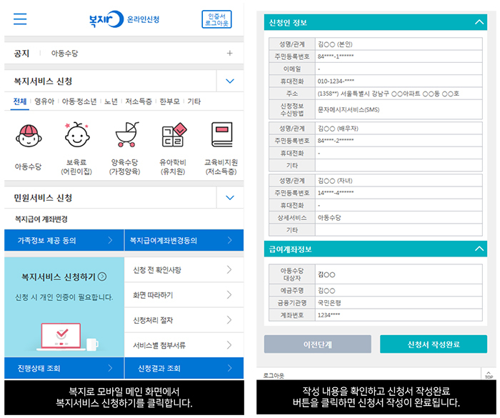 복지서비스 신청> 영유아> 아동수당> 공인인증서 로그인> 신청서 작성> 신청서 작성완료