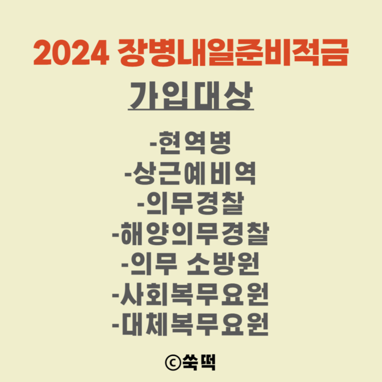이름에서 알 수 있듯이 현역으로 군대를 복무하고 있는 군 장병을 대상으로 신청할 수 있습니다. 현역 장병 뿐만 아니라 상금예비역이나 의무경찰, 대체복무요원도 가입이 가능합니다.